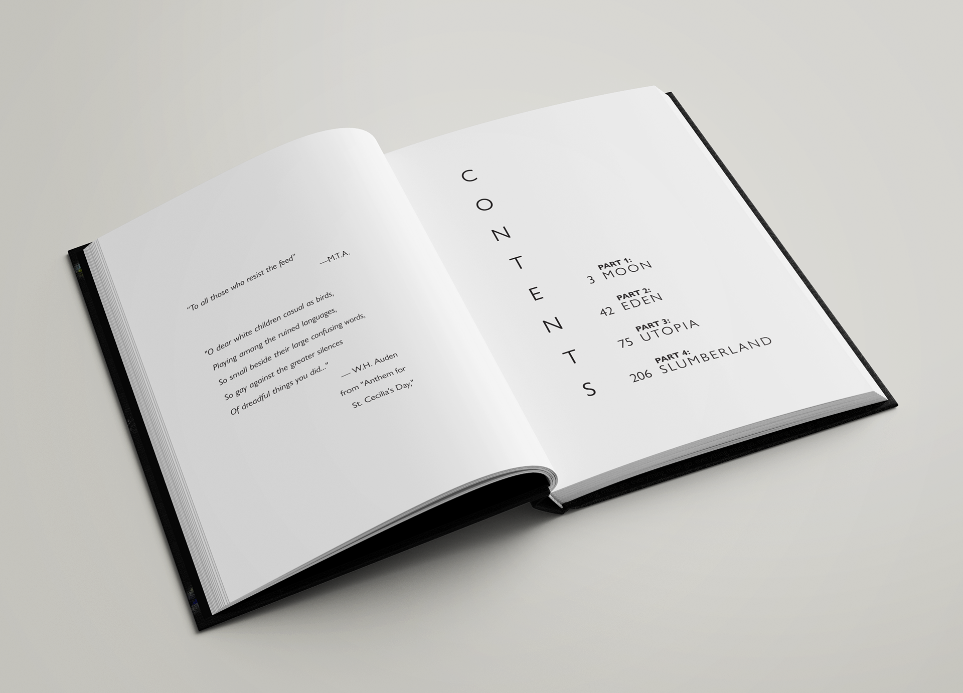 VCD2: Typography Book cover design - Spring 2021 Feed is a book by M.T. Anderson that follows the story of a boy named Titus as he traverses dystopian future rampant with consumerism, facism, pollution, and teenage apathy. In this project, I aimed to redesign the cover of the book in order to entice the readers with a morbid curiosity. In the content of the book, practically everyone owns this device known as the Feed. The Feed is a microchip that is implanted in the brain that allows people to access the world wide web and consume an endless amount of media. Seeing that the Feed served as an over to the consumer's sight, I found it appropriate in the cover to feature the very eyes that are doing the consuming with a glitched standby texture to allude to later tragedy. These eyes peer out of the hazzy textured darkness to show an indeterminate and unknown amount of individuals effected, removing their humanity and reducing them to pure massification. As for the type, a think sans serif is used with a vertical descending motif for a few different reasons. Firstly, it harkens back to the ideas of futurism and modernism that the plot takes place in. Secondly, it hints to the clinical and uncanny nature of the world; it's as though the book is being subtly controlled by a machine from the start.
